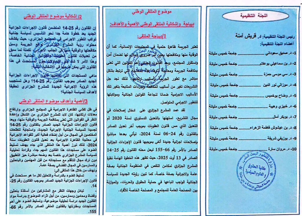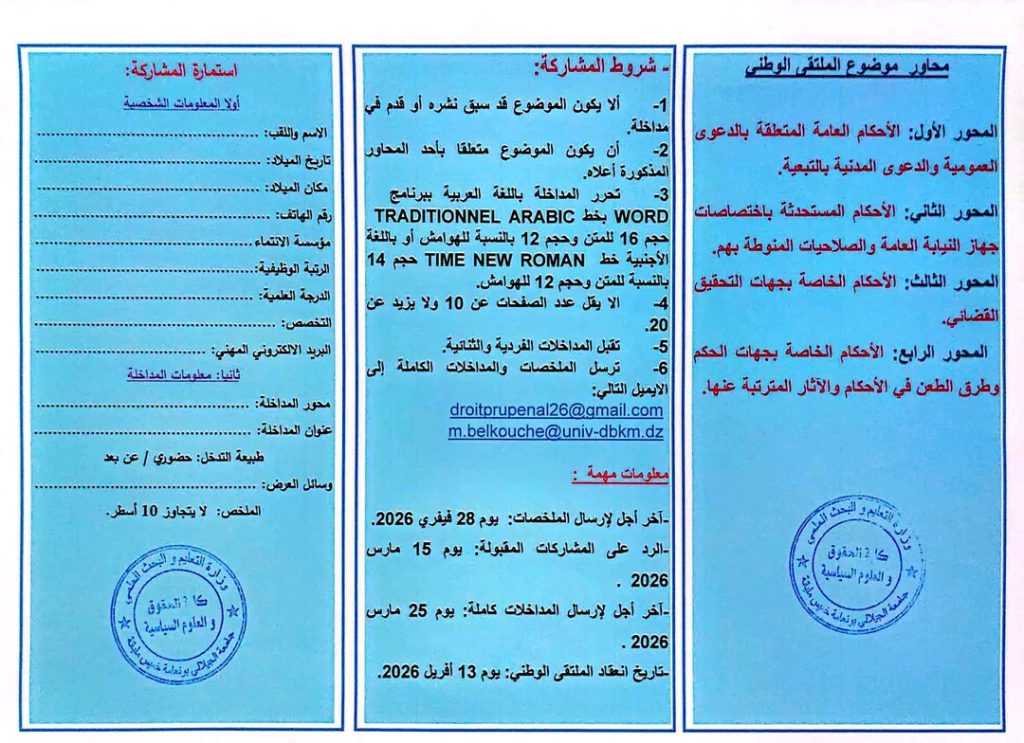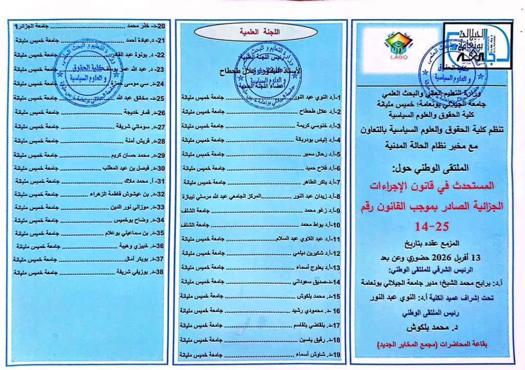 تنظم كلية الحقوق والعلوم السياسية بالتعاون مع مخبر نظام الحالة المدنية ملتقى وطني حول قانون الاجراءات الجزائية بعنوان: