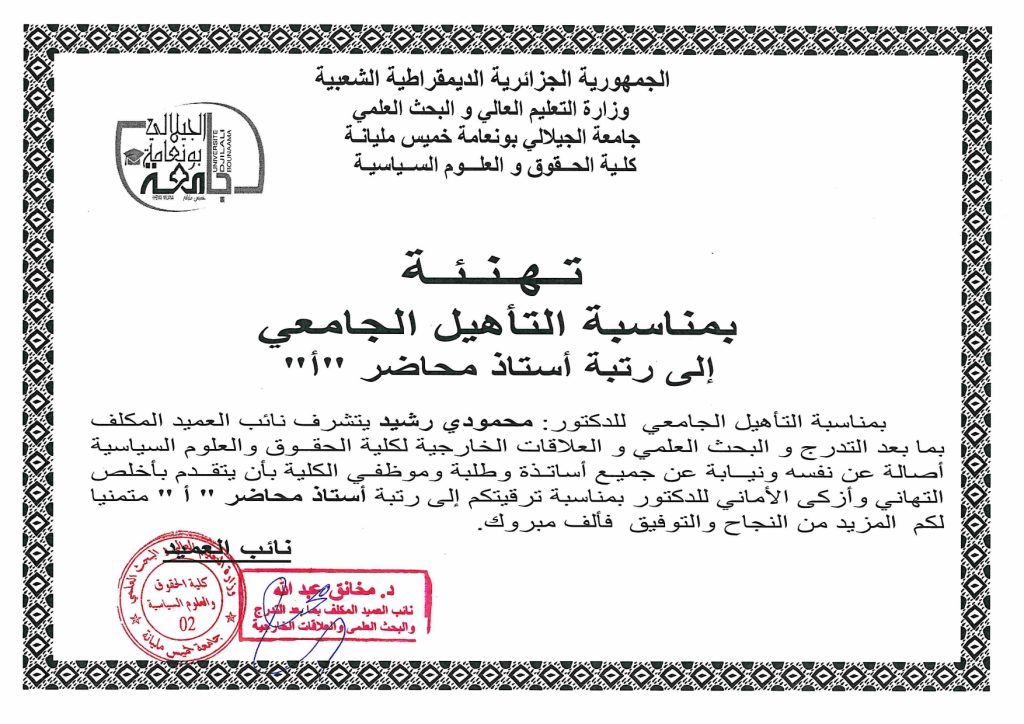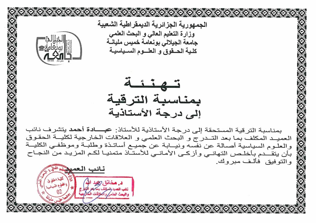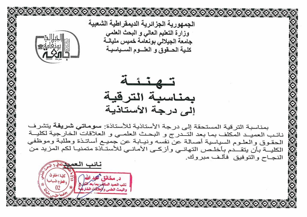 تهنئة بمناسبة الترقية إلى درجة الأستاذية