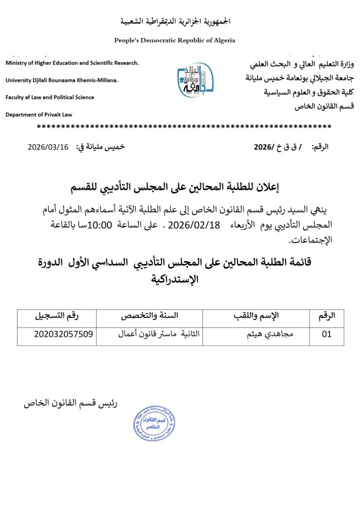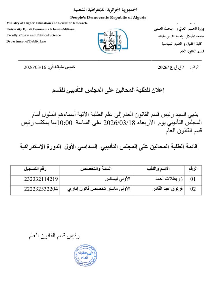 إعلان للطلبة المحالين على المجلس التأديبي للقسم