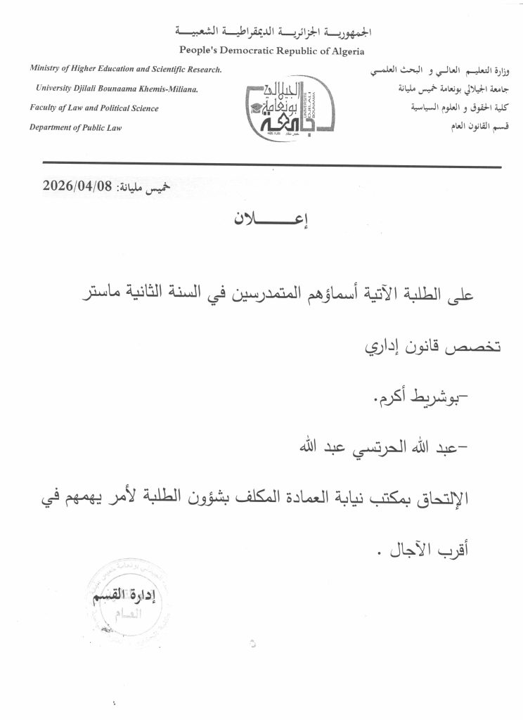 © جميع الحقوق محفوظة لدى كلية الحقوق و العلوم السياسية 2023 .جامعة الجيلالي بونعامة خميس مليانة