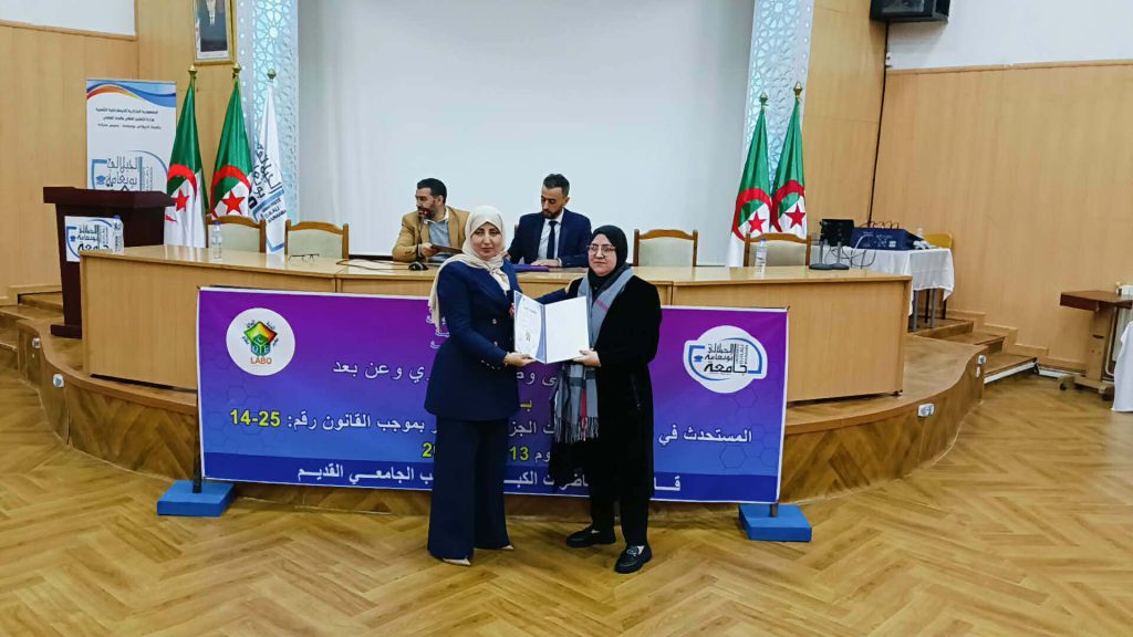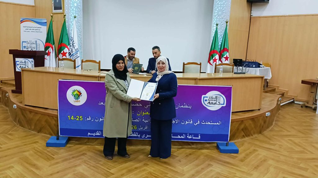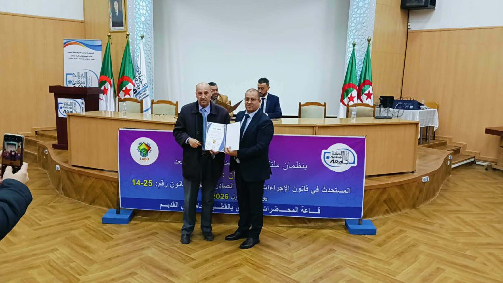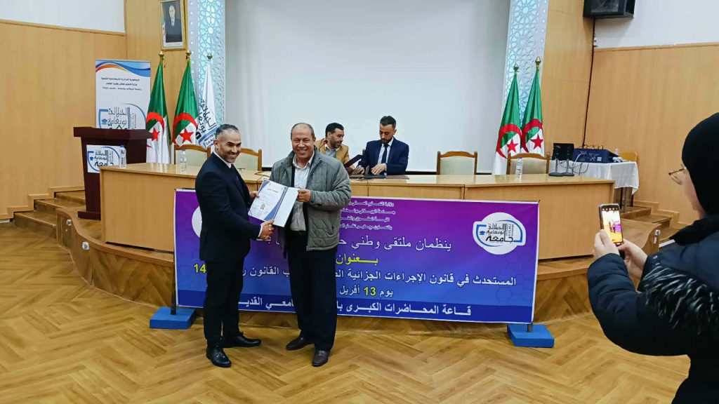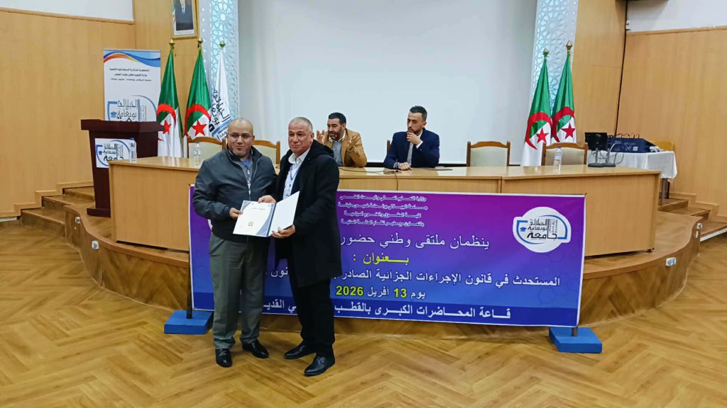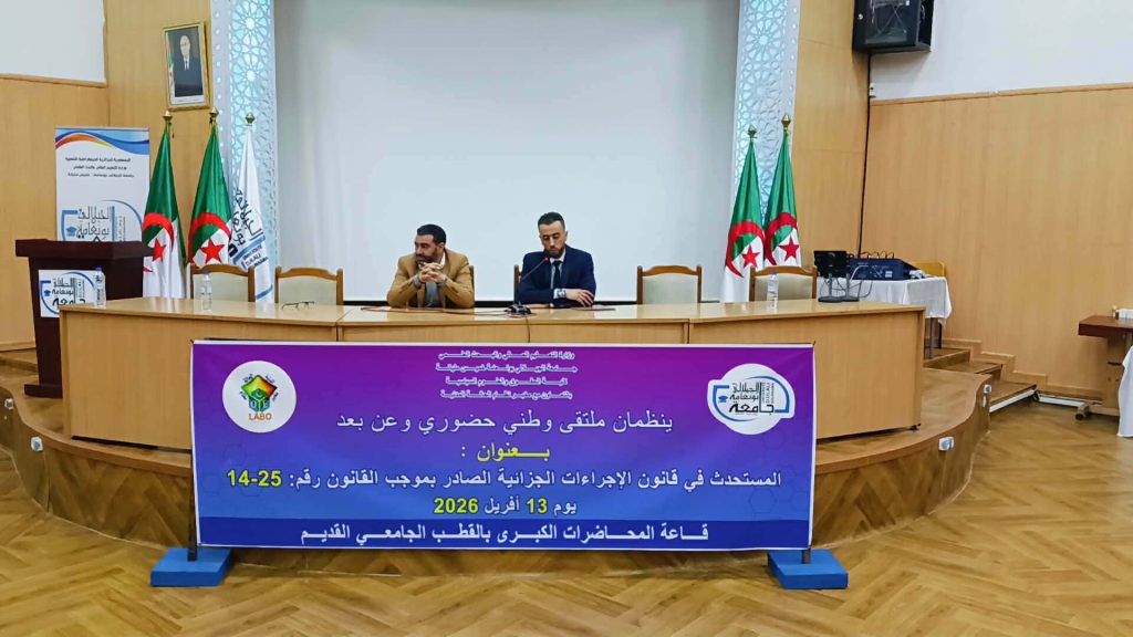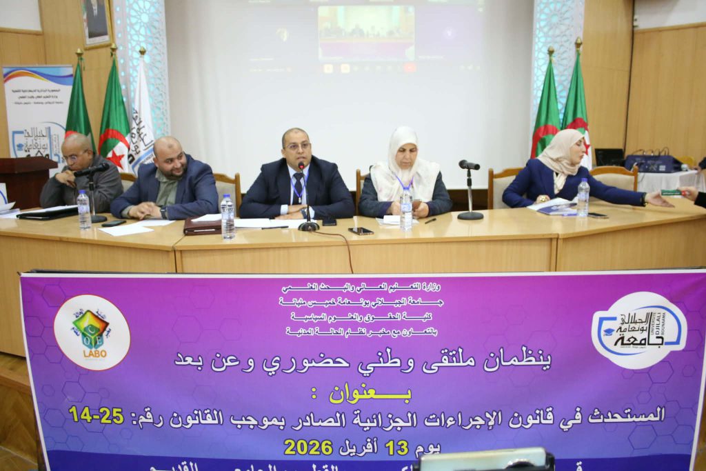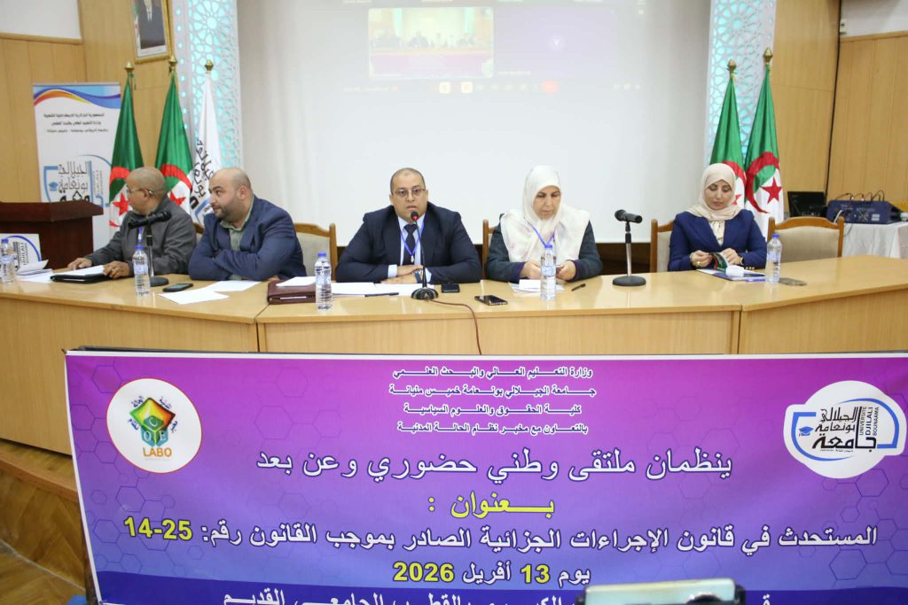 في إطار التظاهرات العلمية التي تنظمها كلية الحقوق والعلوم السياسية تم يوم 13 أفريل 2026 عقد ملتقى وطني حضوري وعن بعد من تنظيم كلية الحقوق والعلوم السياسية بالتعاون مع مخبر نظام الحالة المدنية تناول موضوع المستحدث في قانون الإجراءات الجزائية الصادر بموجب القانون رقم 25-14 بقاعة المحاضرات الكبرى بالقطب القديم بجامعة الجيلالي بونعامة خميس مليانة برئاسة الدكتور محمد بلكوش ورئاسة شرفية لعميد كلية الحقوق والعلوم السياسية أ.د نوي عبد النور
