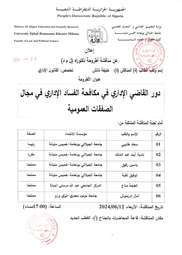 اعلان عن مناقشة أطروحة دكتوراه (ل م د) / غير مصنف / بواسطة webmaster دور القاضي الإداري في مكافحة الفساد الإداري في مجالالصفقات العمومية