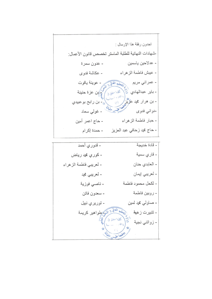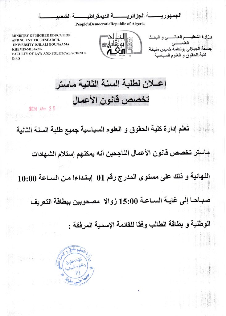 إعلان لطلبة السنة الثانية ماستر تخصص قانون الأعمال