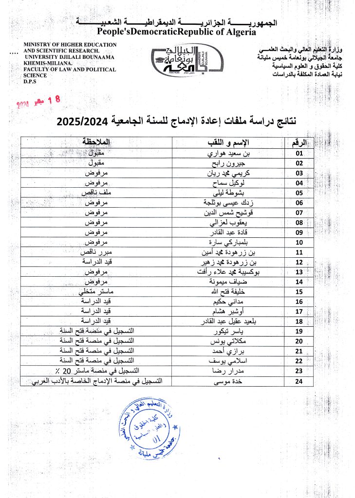 نتائج دراسة ملفات إعادة الإدماج للسنة الجامعية 2025/2024